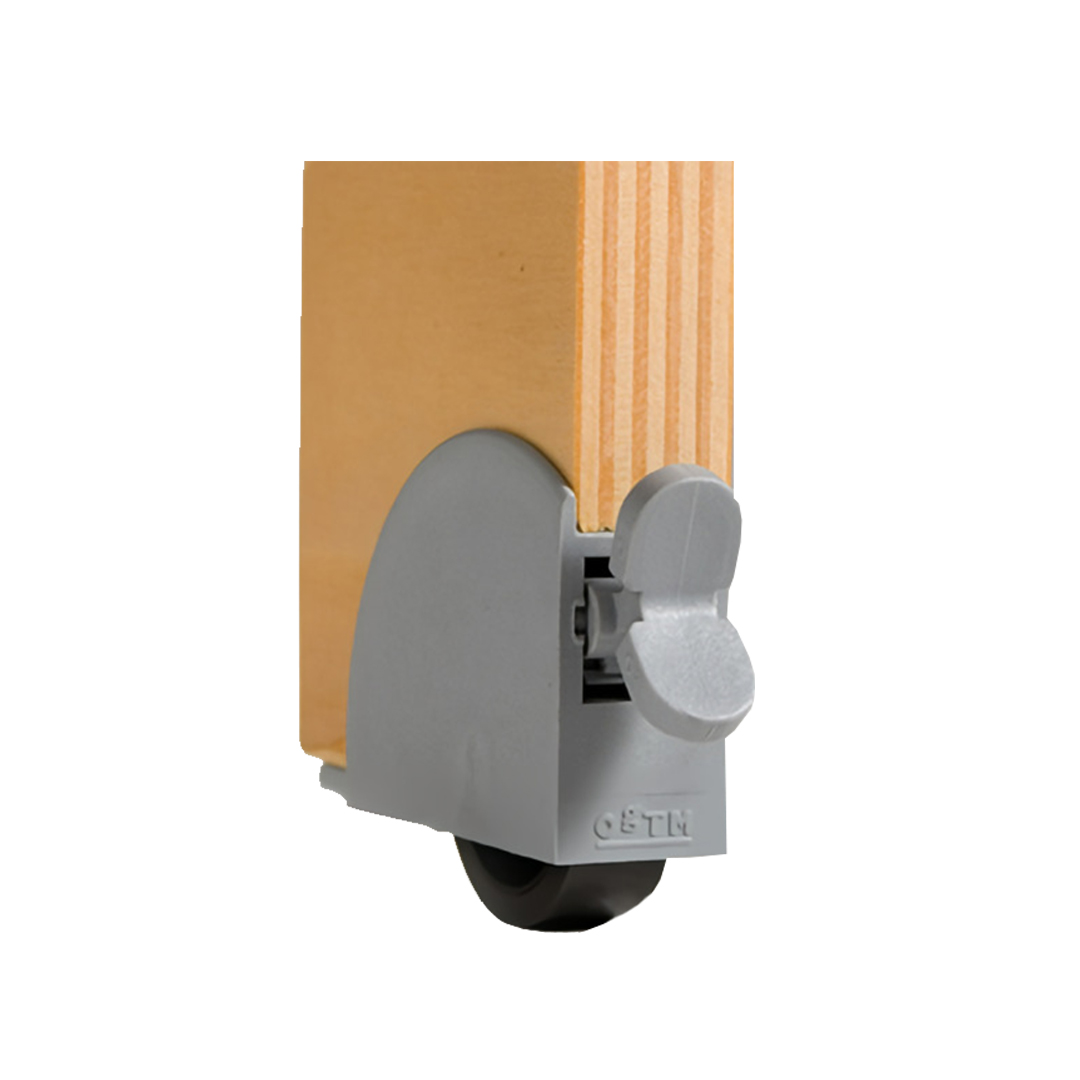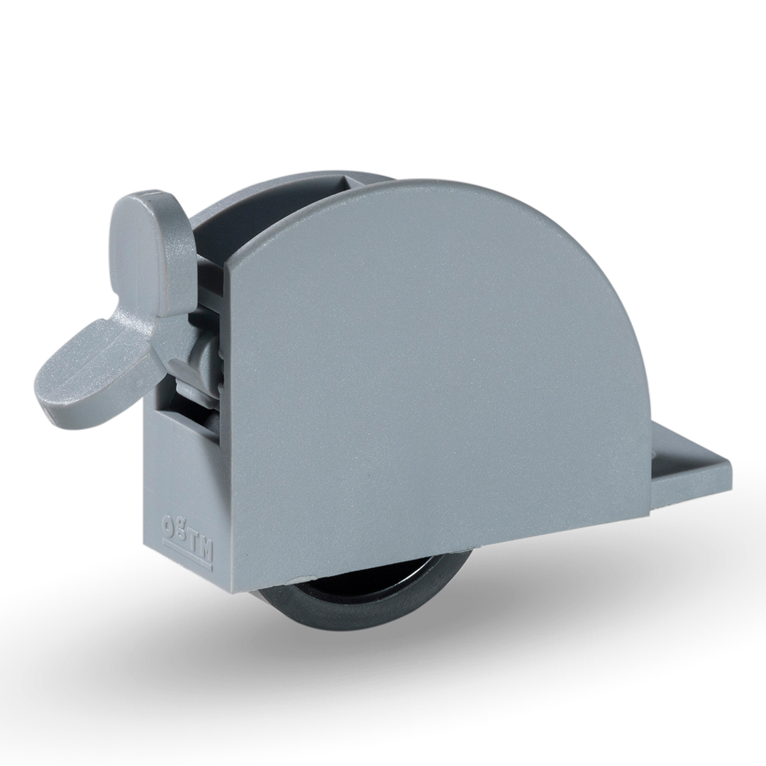 A single-direction castorl that can be fixed to the side of chests of drawers, furniture or small beds. The support, on which the rubber tyre is fitted, is made of nylon. The castor is produced in both side version right and left, It can be equipped with brake, capacity 50 Kg.