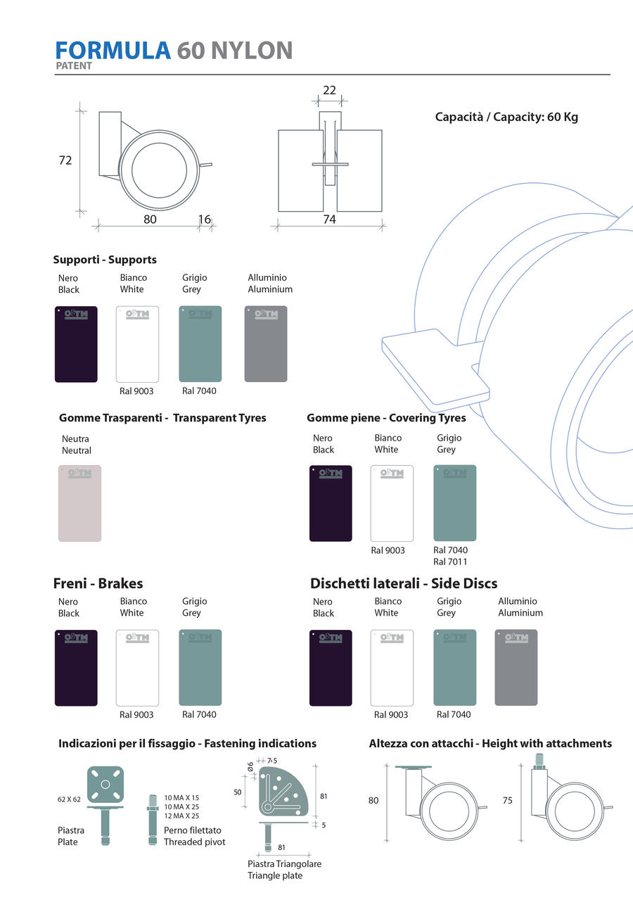 Mobilità, dinamismo e fruizione sono concetti che interagiscono nella caratterizzazione di un progetto industriale massimamente nel design di una famiglia di ruote. Per motivi di eccellenza da un lato: la precisa di offrire al mercato soluzioni tecnologiche e prestazioni meccaniche superiori garantite. Per motivi di estetica coordinata dall’ altro: declinare la inconfondibile forma nelle diverse varianti dimensionali proprie delle più diverse funzioni, dagli spazi domestici, all’ ufficio. Formula collection è la prima famiglia di ruote coordinate ad offrire tutto ciò con i suoi diversi diametri 40,60,80,100 e 120, adatta a soddisfare ogni tipo di esigenza progettuale. Presenta certificazioni internazionali di brevetti e certificazioni di normative Catas.